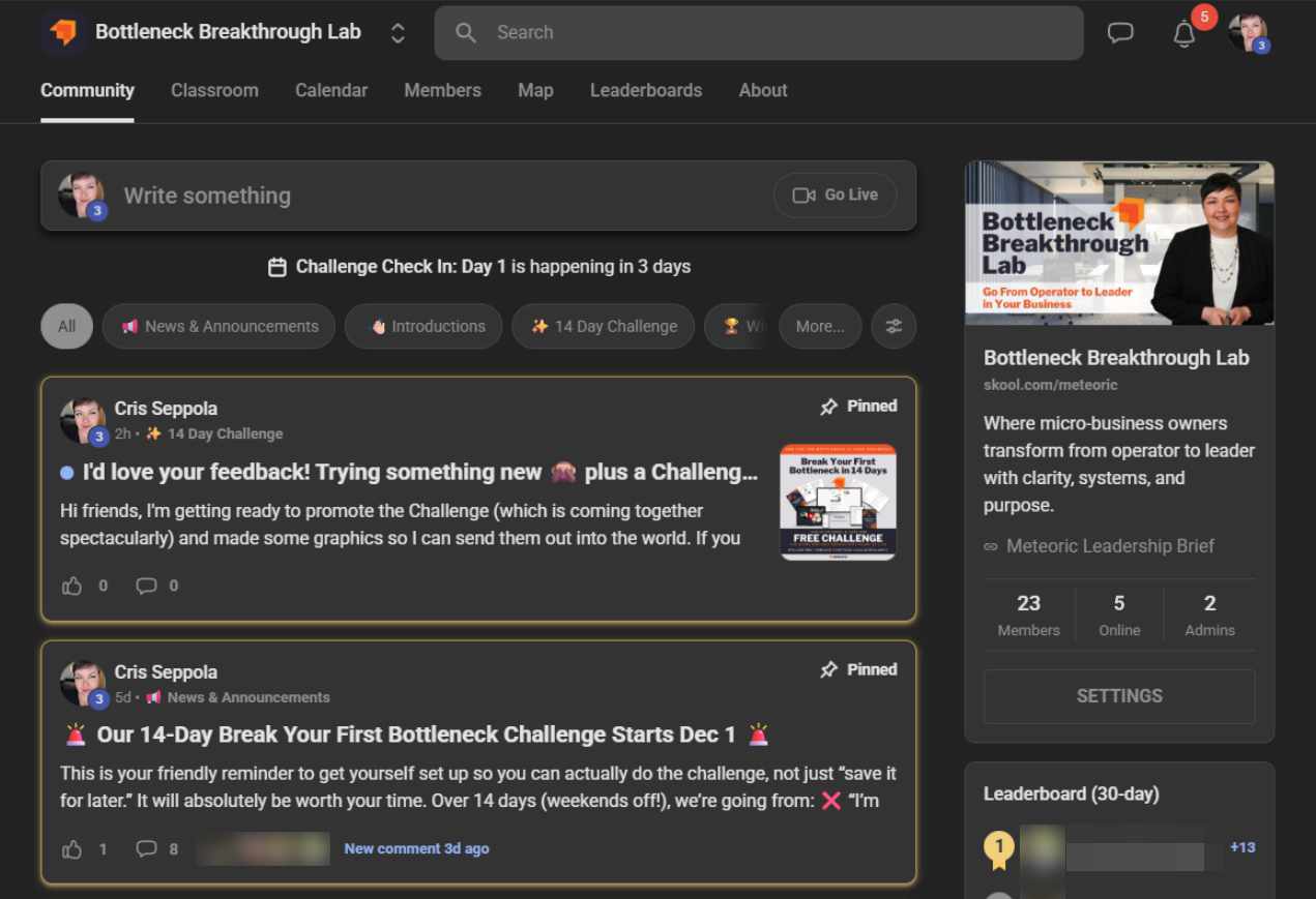 An online community for owners of 3–15 person businesses, built around our flagship leadership program. Connect with peers facing similar challenges, learn simple tools to break bottlenecks, and get live support from Cris.